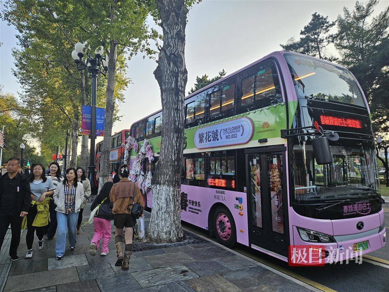 7日下午,极目新闻记者来到长春市朝阳区的新民大街历史文化街区,长春历史文化博物馆门前停放了两辆彩色的春城漫游巴士,粉红色的车身和挂满鲜花的彩色涂装亮眼夺目,吸引众多游客拍照打卡。
