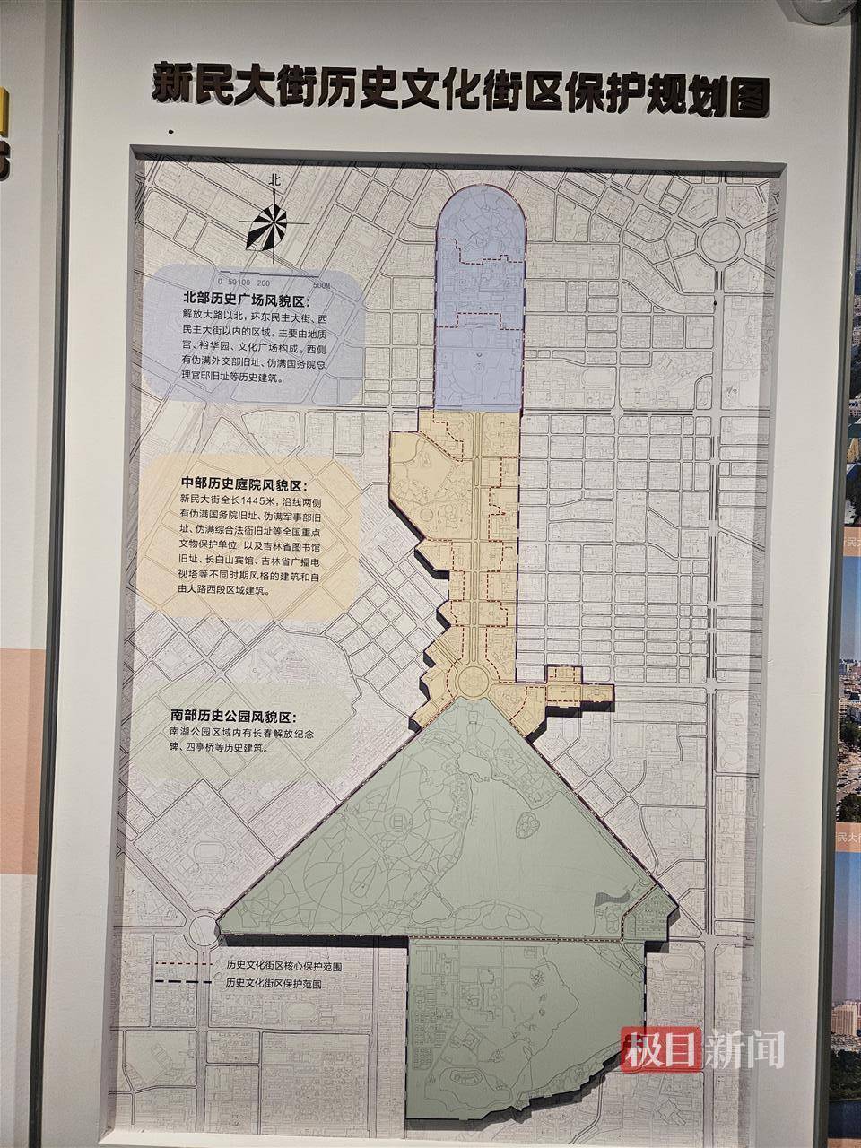 公开资料显示,长春市新民大街北起解放大路,南至新民广场,长1445米,宽55米。新民大街历史文化街区分为北部历史广场风貌区、中部历史庭院风貌区和南部历史公园风貌区。该街区汇聚了不同时期、风格的建筑和设计理念,展现长春市“圆广场,宽马路,散步道”的街路建设特色。