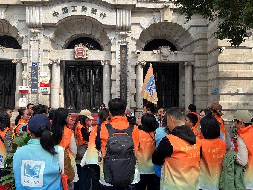 扬子街的斜向街道串联起中山大道与江汉路,也串联起长江的命名往事。袁智边走边分享,从四川的金沙江、两湖的荆江,到安徽的皖江、扬州的扬子江,一条江河的分段称谓,折射出武汉作为南北水运枢纽的地理优势。江边的银行建筑群更是依江而兴的缩影,街边的广东银行旧址格外引人注目,建筑上中西合璧的拼音标注,更是近代中国与世界交流的缩影。沿途的交通银行旧址,高大气派的爱奥尼柱式尽显古典主义风情,其设立初衷竟是为了赎回京汉铁路路权,见证了民族图强的初心;还有风格简洁的四民银行、中国实业银行,与日资背景的台湾银行形成鲜明对比。这些建筑或古典或现代,或官营或民营,在方寸之间上演着近代中国资本的博弈,更彰显了民营资本在艰难环境中蓬勃生长的韧性。