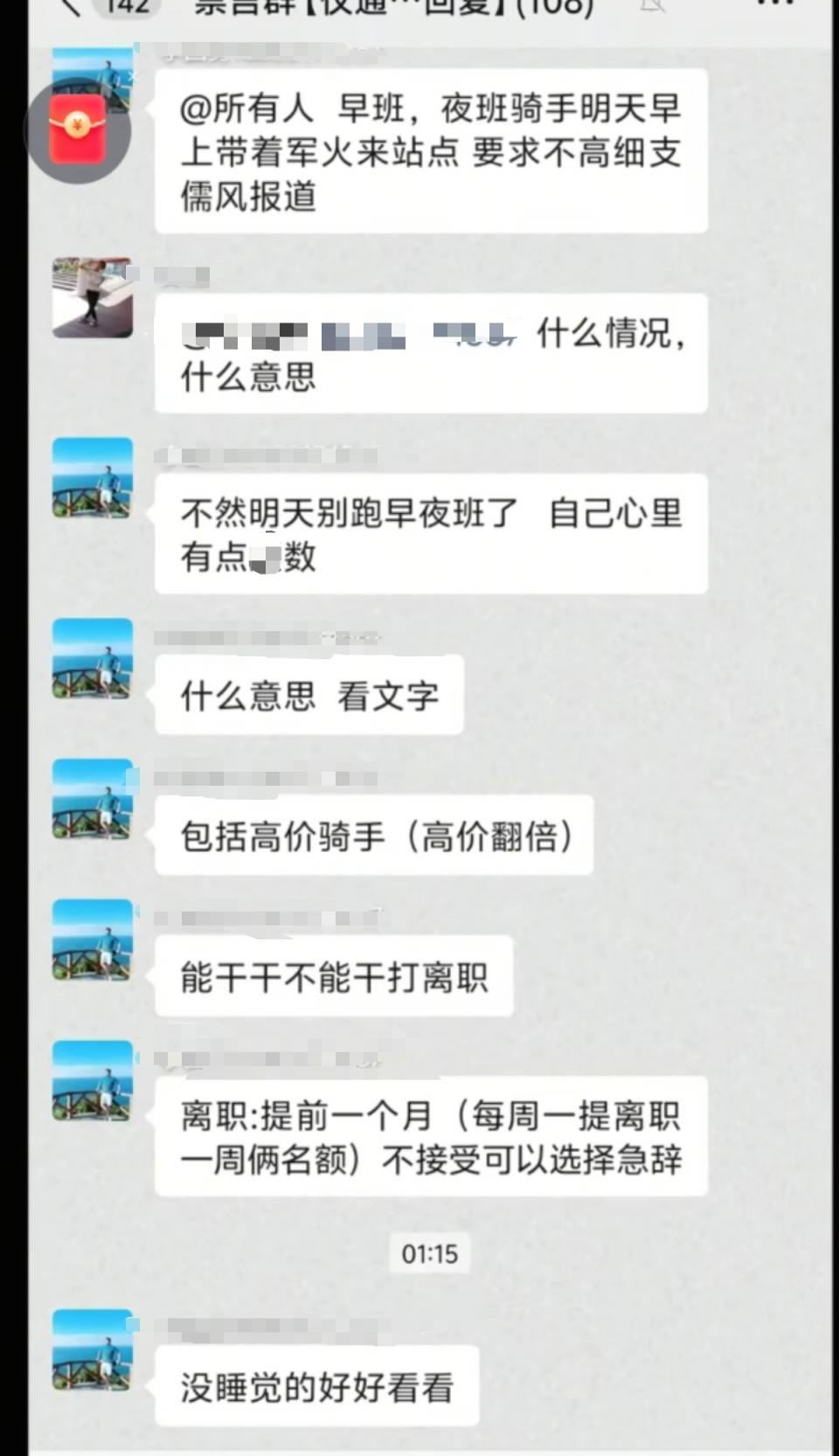 红星新闻记者获得该微信群内的聊天记录,站长李某勇在群内向所有人提醒:“早班,夜班骑手明天早上带着‘军火’来站点,要求不高细支儒风报道。不然明天别跑早夜班了,自己心里有点数。”