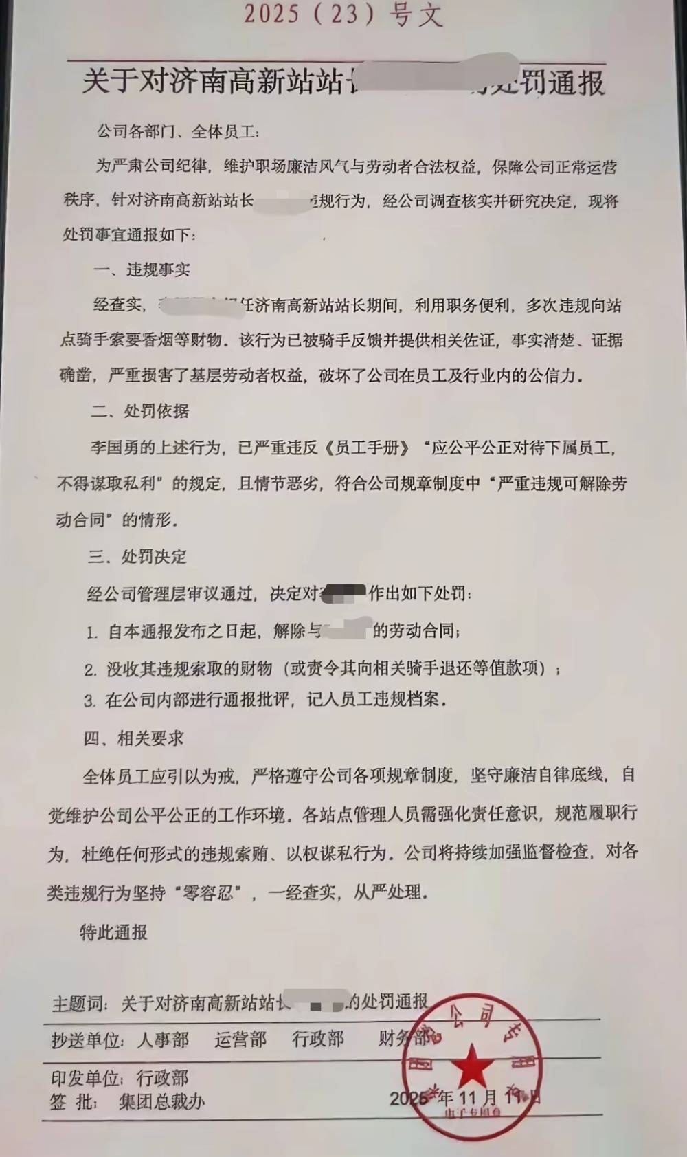爆料该信息的网友告诉记者,此事发生于济南高新区某商场的外卖站点。12日下午,记者多方了解到,涉事站长目前已经被开除处理。记者获得的通报内容显示:经查实,李某勇济南高新站站长期间,利用职务便利,多次违规向站点骑手索要香烟等财物。该行为已被骑手反馈并提供相关佐证,事实清楚、证据确凿,严重损害了基层劳动者权益,破坏了公司在员工及行业内的公信力。