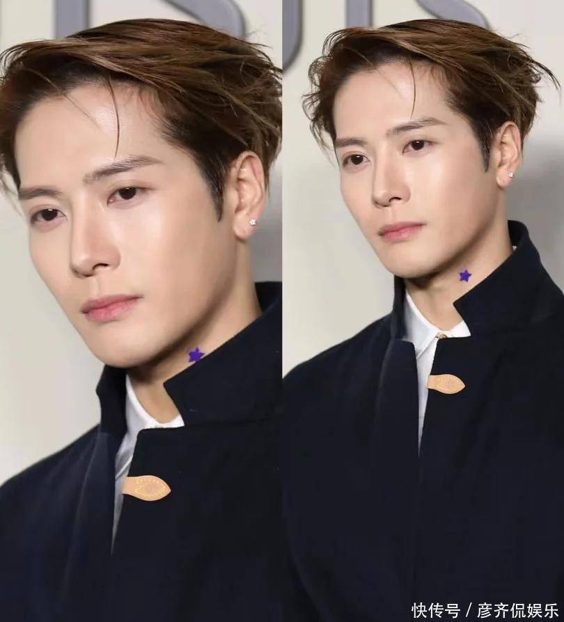 刚刚被王鹤棣那帅炸天的造型惊艳到了,转头一看,结果被王嘉尔脖子上的那条星星项链吸引了注意力。王嘉尔穿着一件 LV 藏蓝色外套,里面搭配白色衬衫,下面配的是同牌子的休闲裤,整个look 简洁又带点设计感,挺有范儿的。不过最吸引眼球的,莫过于他脖子上的那块星星贴画,走动之间,隐隐透露出一股叛逆的劲头。
